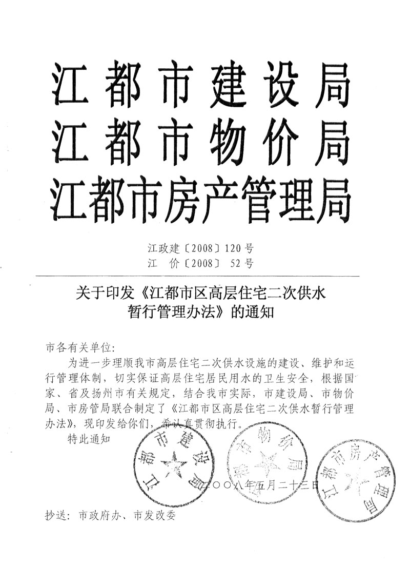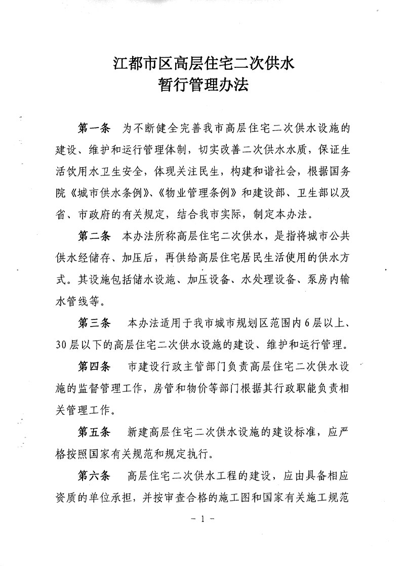 江都城區(qū)高層住宅二次供水暫行管理辦法
