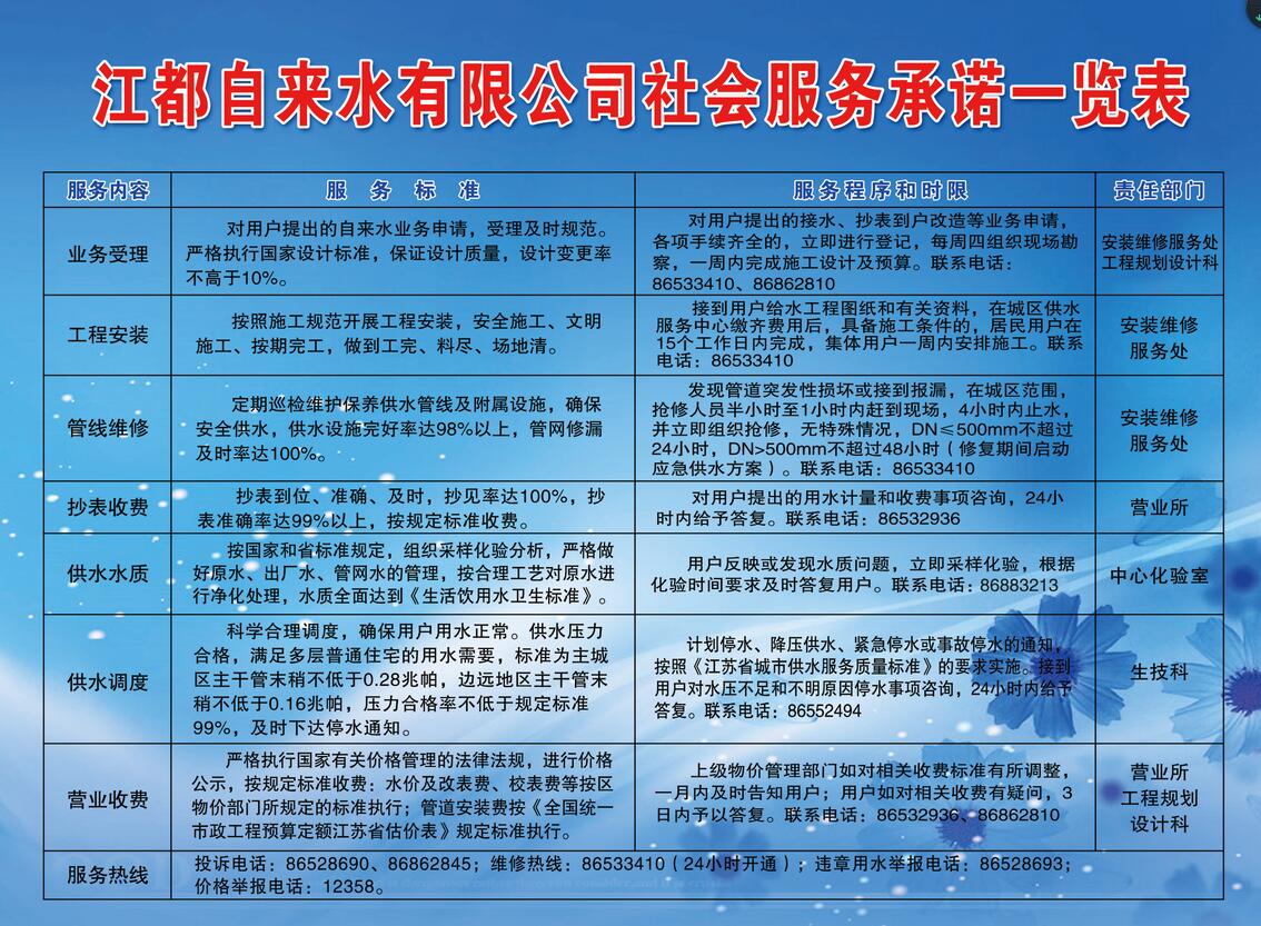 江都自來水有限公司社會服務(wù)承諾一覽表
